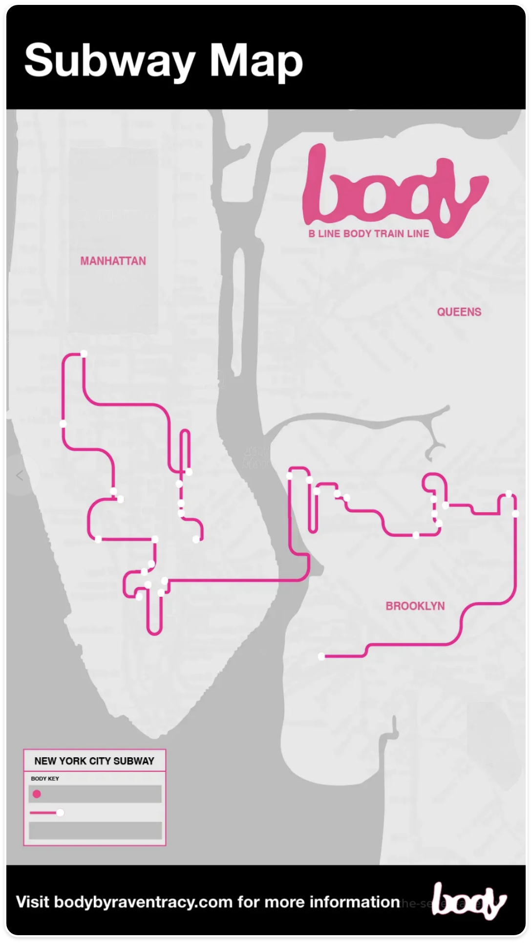 Body by Raven Tracy partnered with The Seven Agency to develop a graphic system for her NYC 2025 pop-up shop. The objective was to translate brand identity into physical space using a visual language rooted in the NYC subway system [signage, direction, hierarchy].